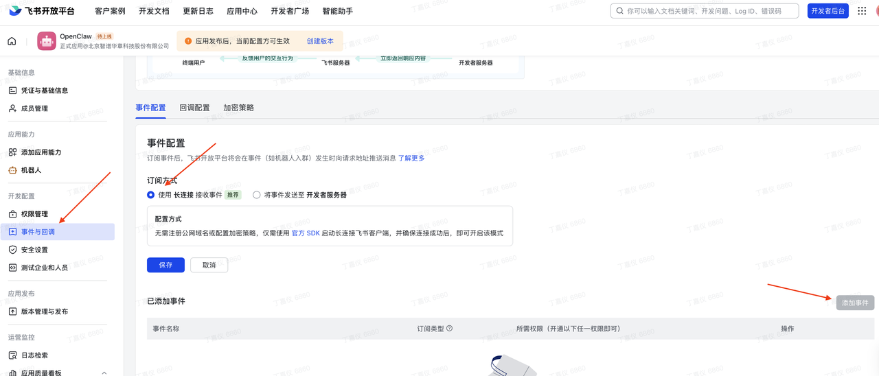 AutoGLM配置成功后,回到飞书开放平台,完成下列配置:配置事件订阅
