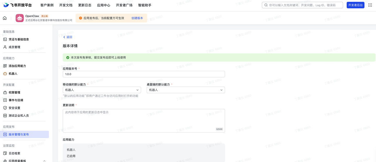 - 点击 “保存” 并 “确认发布”(如是企业自建应用,管理员审核通过后即可生效;如果是个人测试租户通常自动通过)。