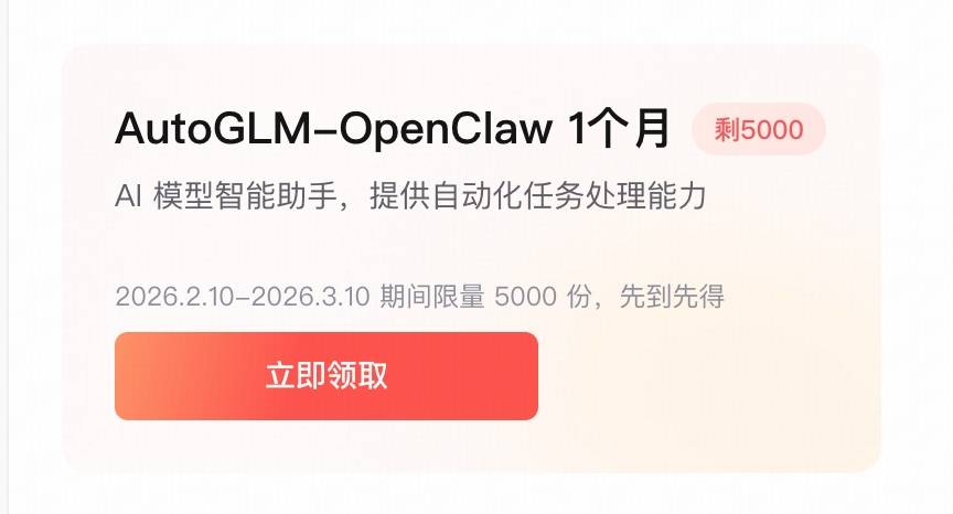 本权益为 AutoGLM-OpenClaw 1个月使用权,该权益仅面向 Max 及 Pro 用户,限量 5000 份,领完即止。👉点击领取