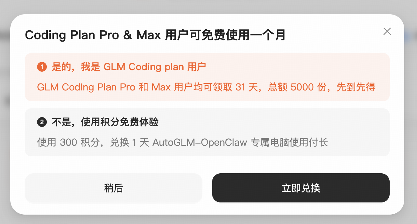 本权益仅限 Coding Plan Pro 及 Coding Plan Max 用户领取,普通用户如需体验可以使用AutoGLM积分进行兑换。