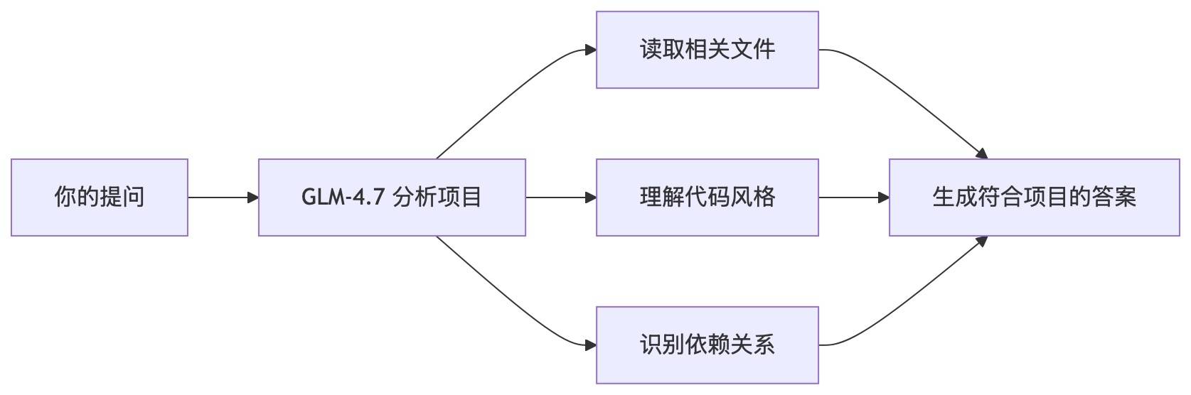 GLM-4.7 不是在真空中工作的——它能够理解你的整个项目结构。这意味着: