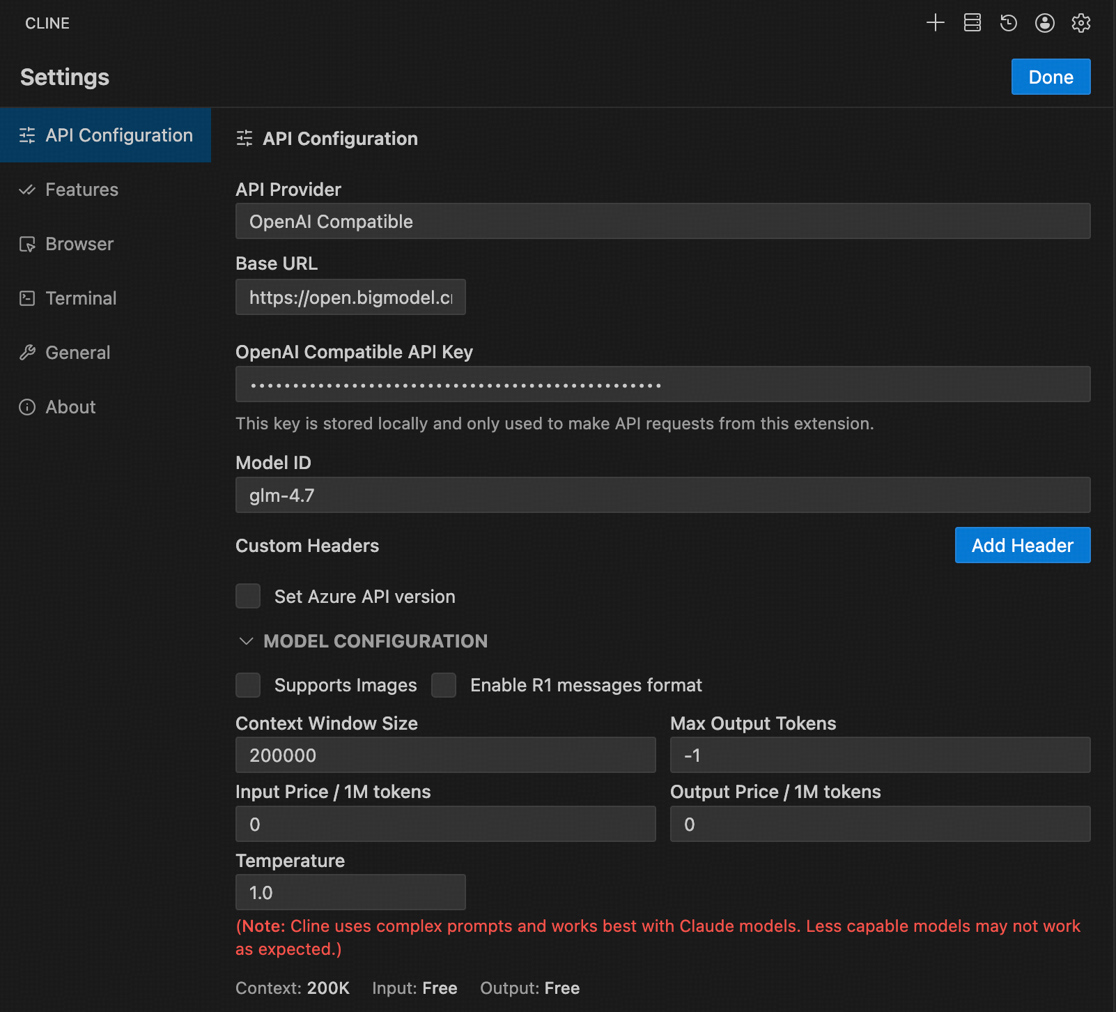 https://open.bigmodel.cn/api/coding/paas/v4 - API Key:填入您的智谱 API Key