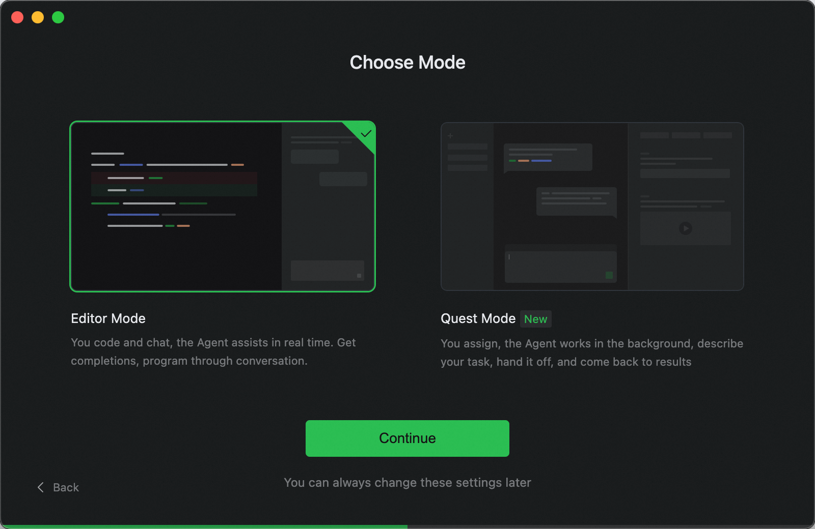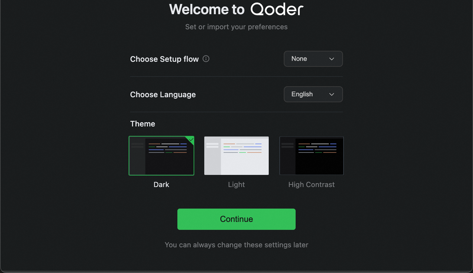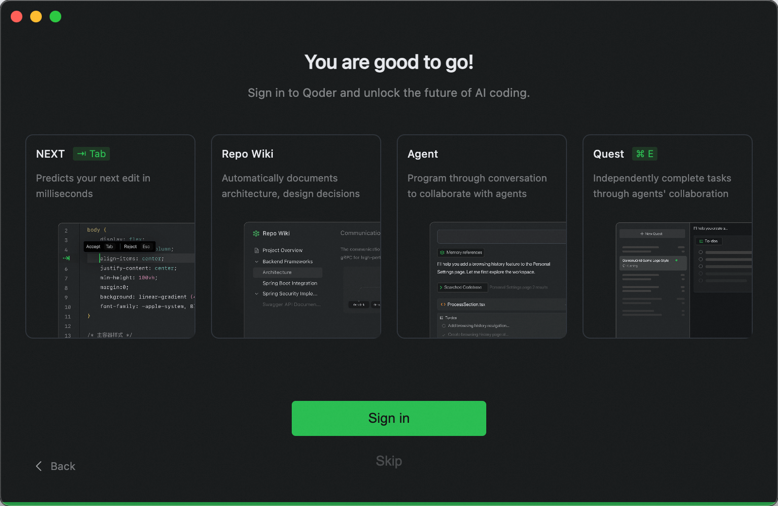 - 初次启动 Qoder 后,需要完成初始配置。