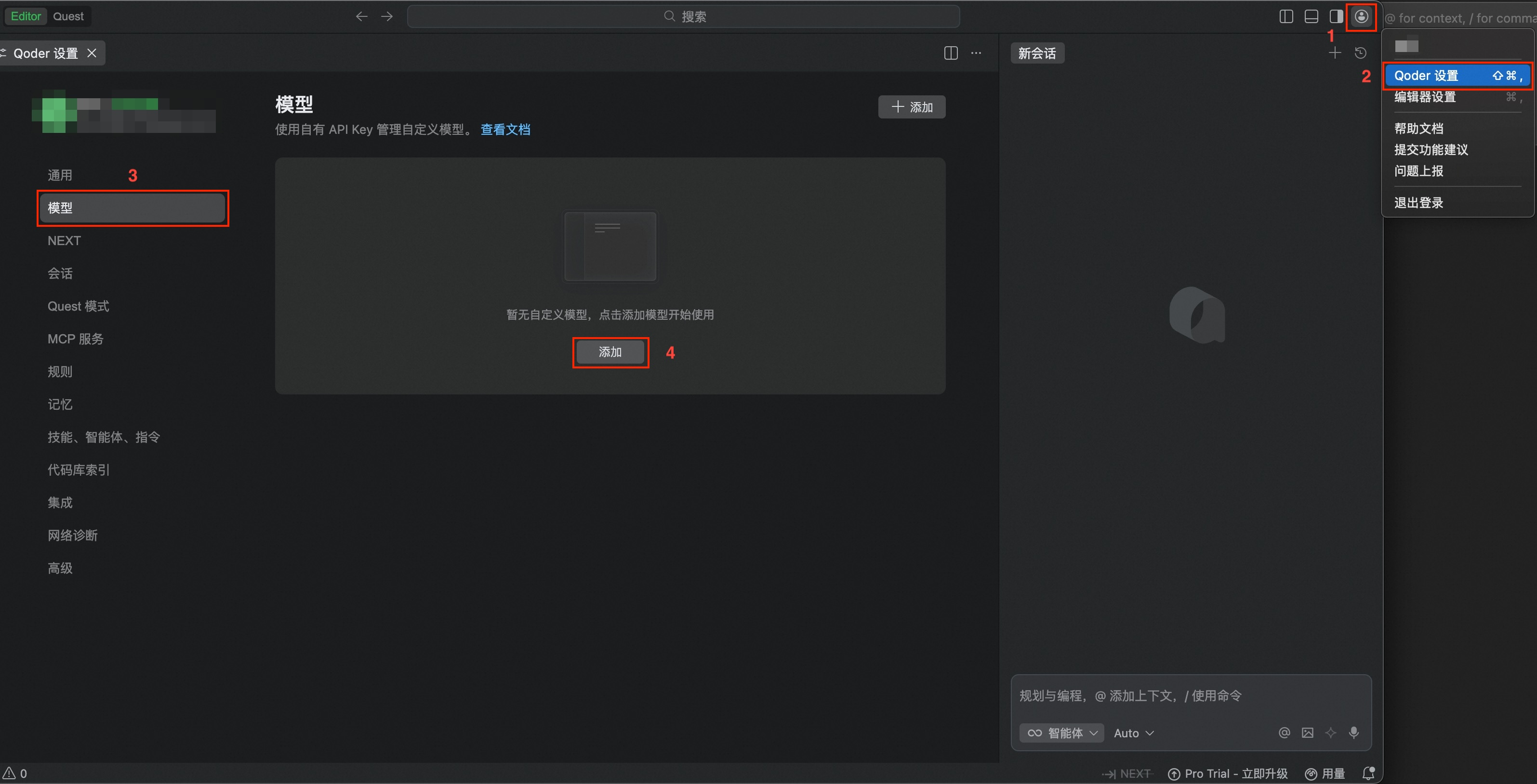 - 在界面右上角打开 Qoder 设置。选择模型,单击添加。