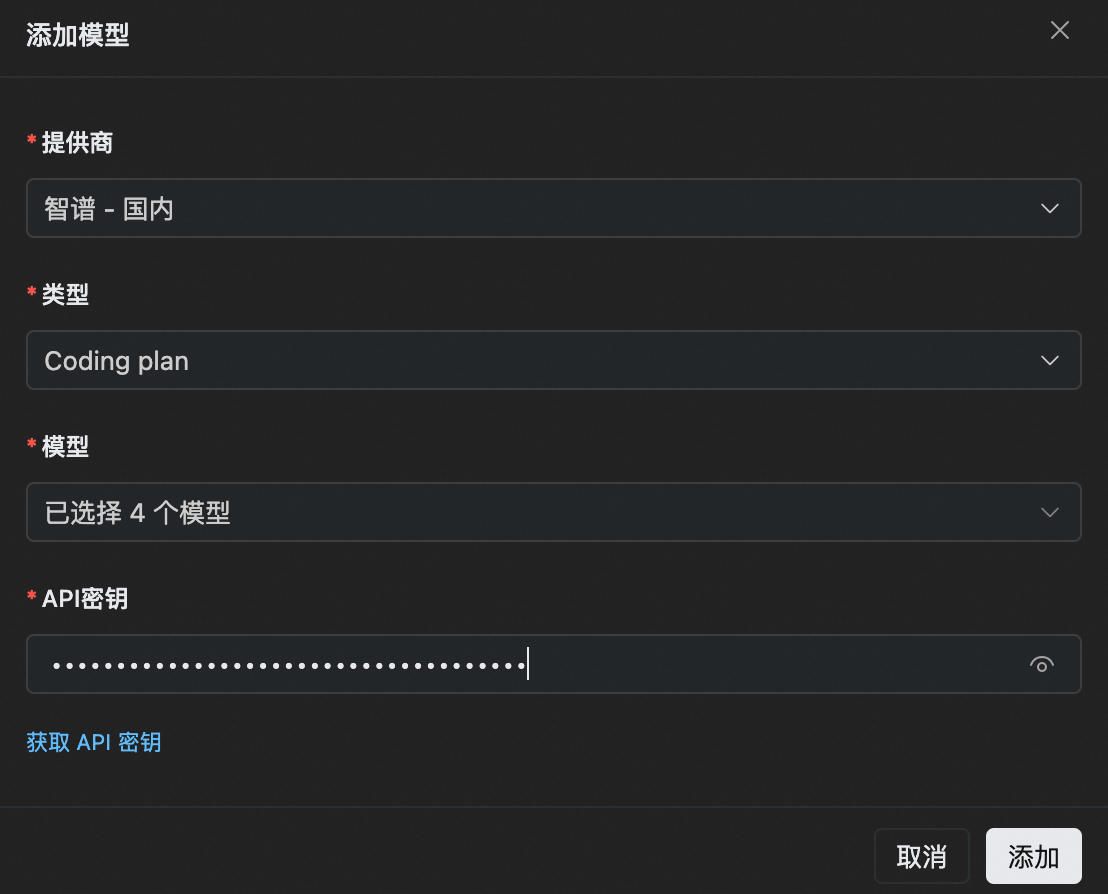 | 提供商 | 在下拉菜单中选择“智谱” |