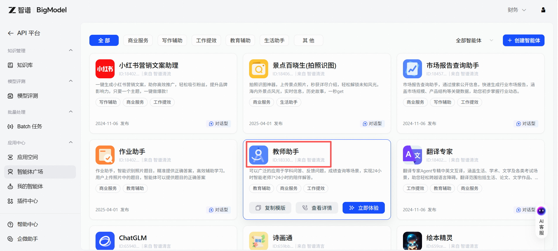- 根据您的场景,在智能体中心中寻找与之类似的智能体,如智能客服、陪练、图生文等(此处以”教师助手”为例);