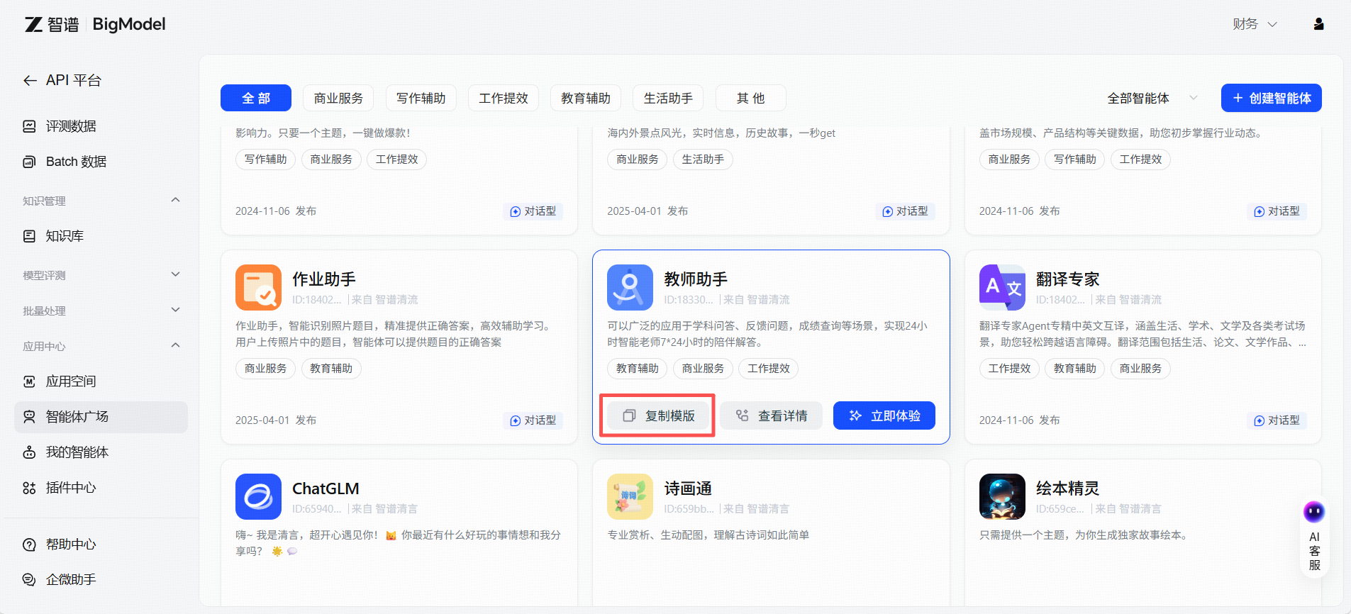 智能体广场是为客户精心准备的模版库,其中汇集了智谱精选出的智能体模版。这些智能体模版涉及场景广、通用性强、复用性高,您可以在智能体中心寻找与您场景类似的智能体,体验它的效果、查看它的画布与 Prompt、一键复制您满意的智能体到您的账户内,减少您大量的开发时间。