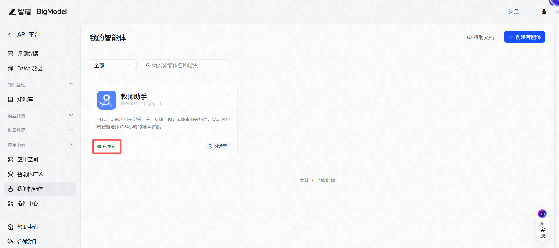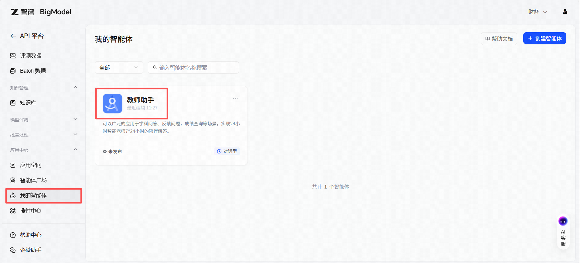 - 您可以通过访问链接:https://open.bigmodel.cn/console/appcenter_v2/intelligent/center 直接访问