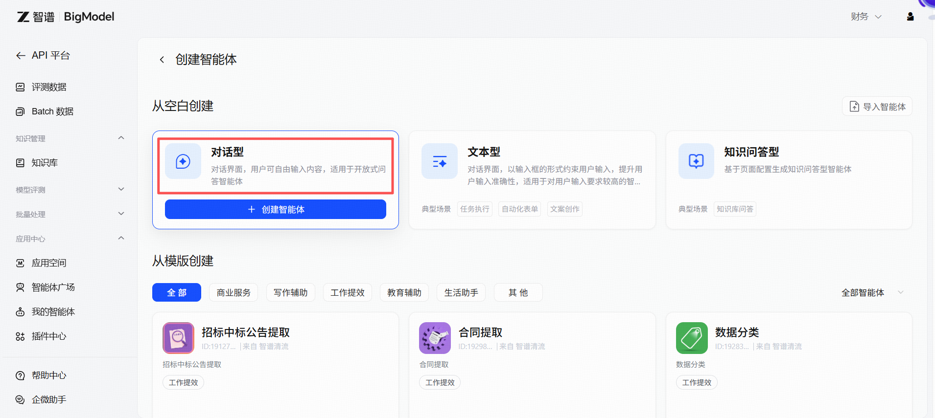 - 在”从空白创建”中,选择合适的智能体类型,鼠标悬浮后,点击按钮”创建智能体”
