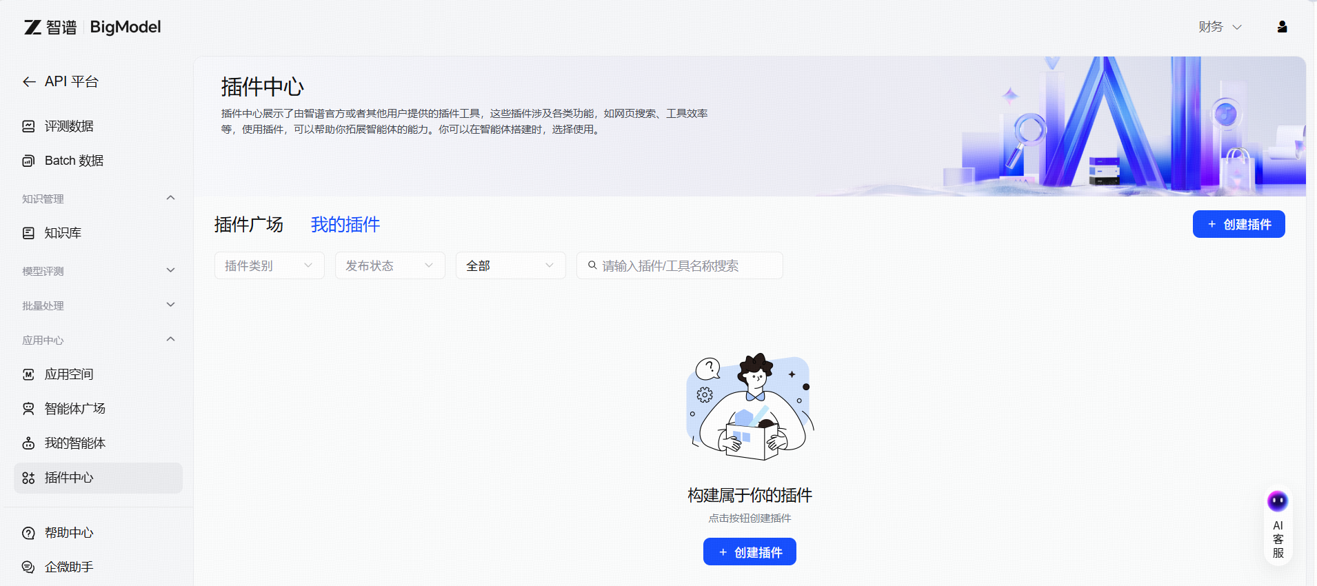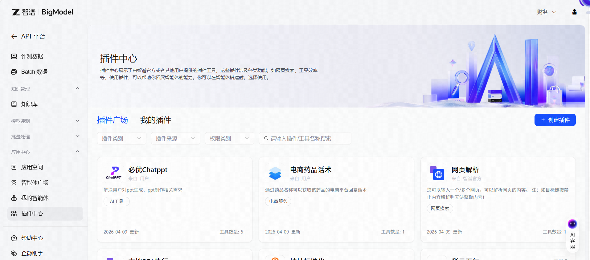 插件广场展示了由智谱官方精心挑选的公开插件工具和其他用户上架的私有插件,这些插件涉及各类功能,如网页搜索、工具效率等,使用插件,供您在搭建智能体时使用。