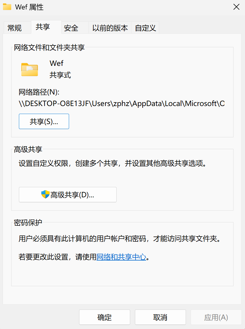 共享成功后,会显示类似如下的网络路径:\你的电脑名\Wef ,请记录该路径,后续需要使用。