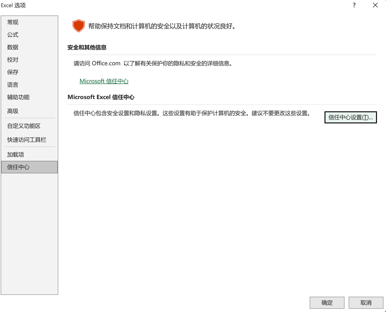 第四步:在 Excel 中信任共享路径完成共享后,需要在 Excel 中将该网络路径添加为“受信任的加载项目录”。1. 打开信任中心在 Excel 中依次点击:文件 → 选项 → 信任中心 → 信任中心设置(T)...