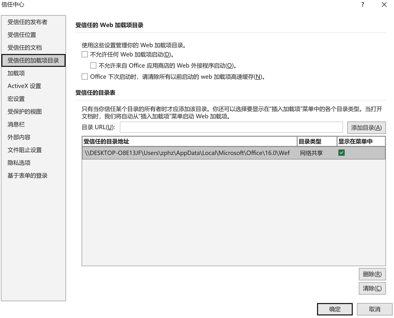 受信任的加载项目录。 - 在 “目录 URL(U)” 输入框中填写共享路径,例如: