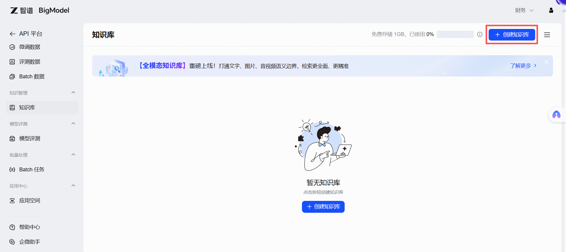 用于管理知识文件,支持上传多个文件,并通过知识库 ID 后进行关联调用。知识库最大容量为 1G。
